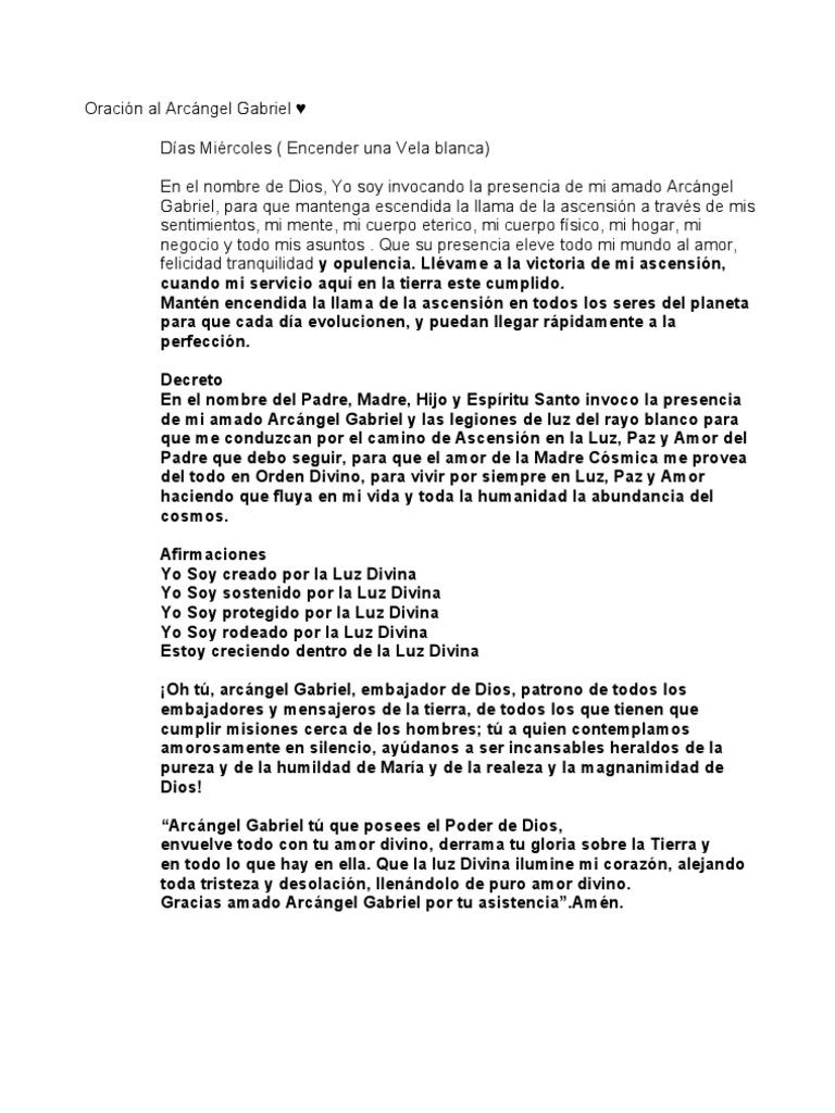 Gabriel te aportará fuerza física, habilidades de crianza, comodidad suprema, será pata ti un guía útil. O arcngel gabriel, para que mantenga escendida la llama de la ascensin a travs de mis sentimientos, mi mente, mi cuerpo eterico, mi cuerpo fsico, mi hogar, mi negocio y todo mis. Las oraciones elevadas a san gabriel arcángel son las indicadas para todo tipo de peticiones, ya sean la protección, el amor, la salud o el dinero. Con esta poderosa oración podrás traer el amor a tu vida. «el amor está dentro de nosotros».