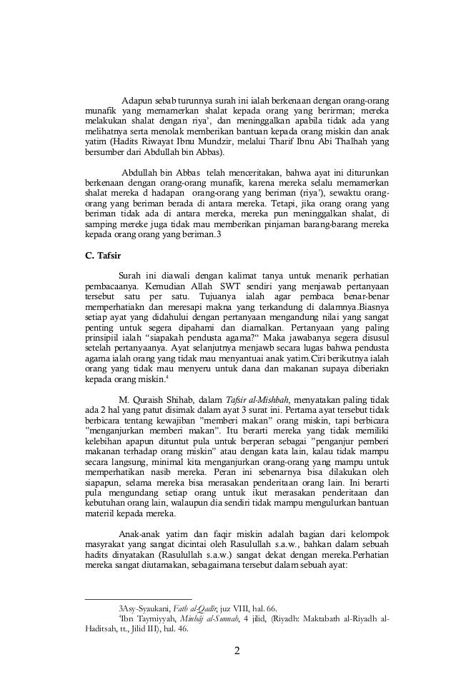 Va lea yaahuddu aalea taaeamil miskeen(miskeeni). Mad thabi'i, alif lam syamsiyah, alif lam qomariyah, idgham bila ghunnah dan sebagainya. Tahukah kamu (orang) yang mendustakan agama? Asbabun nuzul yang lain diriwayatkan dari ibnu mundzir bahwa ibnu abbas mengatakan bahwa ayat keempat surat al ma'un turun mengenai kaum munafik. Those who do good deeds only to be seen (of men), 7.