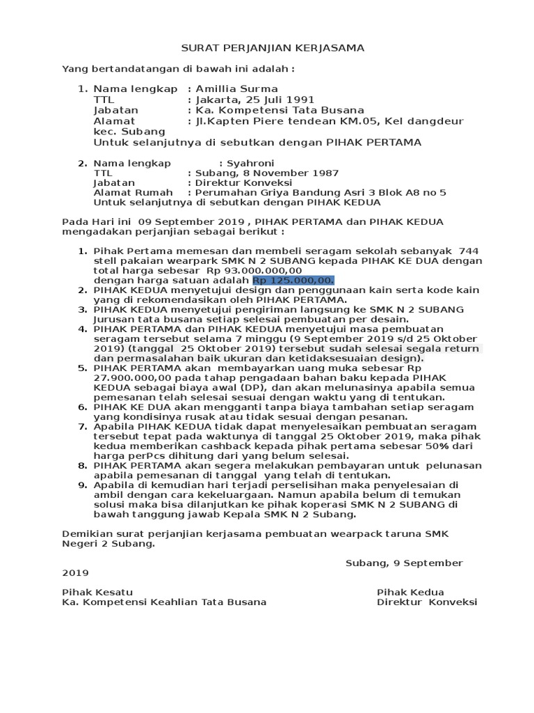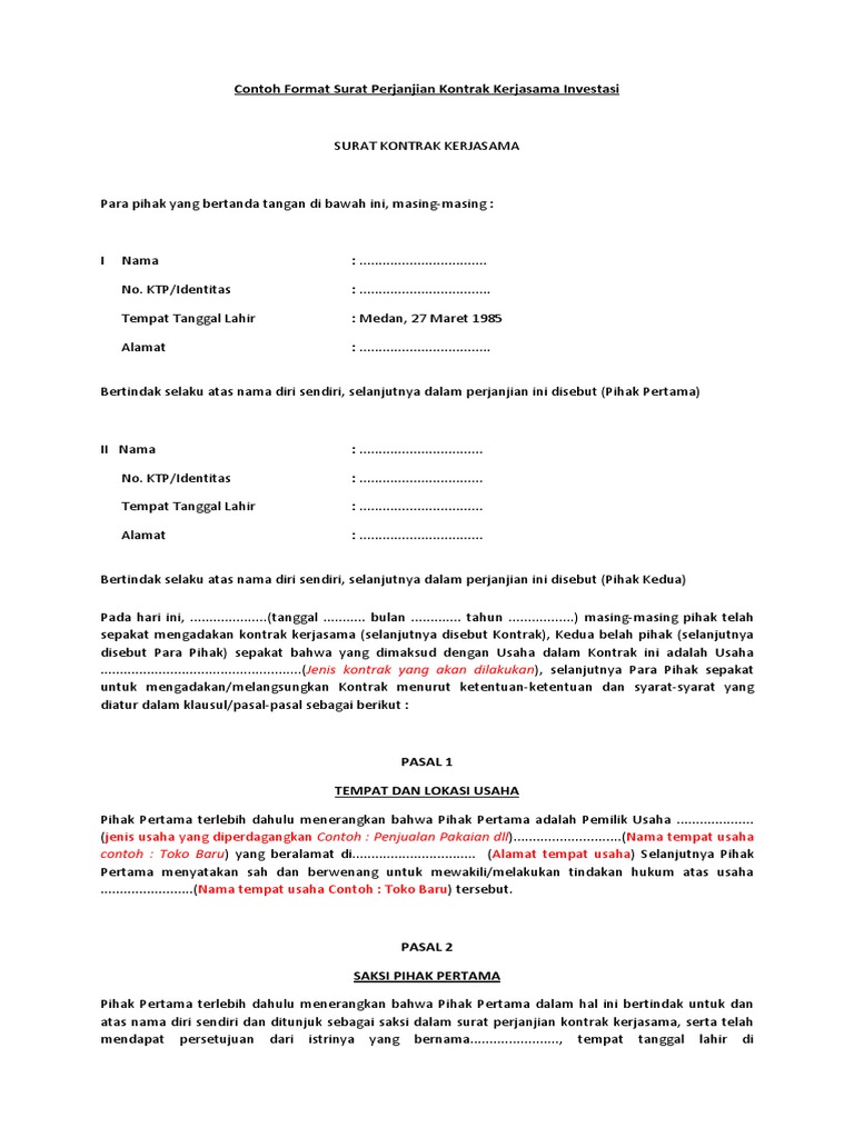 Berikut contoh langsung dari surat perjanjian kerjasama antara dua pihak. Menulis surat kerjasama bisnis sebenarnya tidak sulit. Contoh surat perjanjian yang baik dan benar dapat kamu gunakan sebagai referensi dalam menyusunnya. Artinya, anda perlu menyusun surat perjanjian kerjasama yang sifatnya mengikat kedua pihak. Surat perjanjian kerjasama tidak boleh dibuat asal, karena akan menjadi pedoman dalam menjalankan sesuatu hal kerjasama. Melalui kerjasama tersebut, pebisnis dapat memperoleh keuntungan lebih besar. Contoh surat kerjasama dalam bidang bisnis dan olahraga secara lengkap dan dibubuhi materi. Surat perjanjian kerja sama penting untuk dibuat agar menghindari saat bekerja sama baik itu berupa kepemilikan sebuah bisnis atau pembagian hasil tidak terjadi cekcok. Hal ini dilakukan supaya terhindar dari kontroversi yang terjadi di kemudian hari. Ketika dua orang atau 2 instansi melakukan kesepakatan, biasanya akan diperlukan sebuah perjanjian atau jaminan untuk kepastian. Melihat kembali pada pengertiannya tidak melulu dalam hal kerjasama bisnis, surat perjanjian juga biasa dilibatkan dalam kegiatan bahwa pihak kedua selaku pengelola dana investasi di bidang produksi bahan pakaian yang berlokasi di jl. Surat tersebut digunakan sebagai bukti tertulis telah terjadi perjanjian antara pihak pertama dan pihak kedua. Untuk itu, anda pasti membutuhkan contoh surat perjanjian kerjasama di setelah masa percobaan tersebut, pihak pertama dan pihak kedua akan mengadakan evaluasi penilaian bersama sebagai bahan.