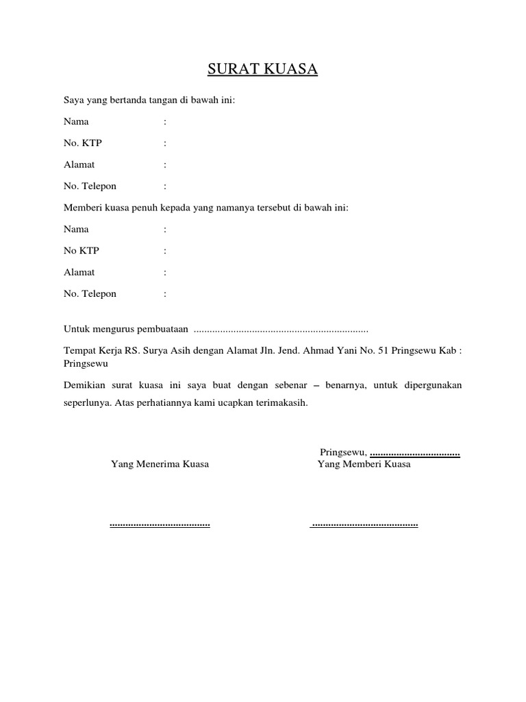 Oke, kali ini kami akan yaitu tentang surat kuasa, diharapkan dengan membaca artikel ini kamu dapat mengerti dan bisa. Surat ini akan menjadi bukti agar. Sebelum membuat surat kuasa, ada baiknya ketahui contoh surat kuasa yang baik dan benar terlebih dahulu. Surat kuasa adalah suatu surat yang isinya menjelaskan tentang pemberian wewenang atau kuasa dari satu pihak tertentu kepada pihak lain yang diberikan kepercayaan karena si pemberi kuasa tidak. Surat kuasa dibuat oleh seseorang yang memiliki kesibukan atau halangan tertentu dan diberikan kepada orang lain yang terpercaya dikarenakan yang bersangkutan tidak dapat melakukan suatu hal. Surat kuasa dapat digunakan untuk mewakilkan diri. Kendati demikian, tak bisa semudah yang dibayangkan untuk bisa. Surat kuasa pembukaan rekening adalah surat kuasa yang diajukan untuk membuka rekening bank, baik itu rekening milik atau atas nama pribadi, badan, yayasan, lembaga, maupun perusahaan dari. Kondisi yang tidak menentu terkadang membuat kita. Surat kuasa merupakan surat resmi berkekuatan hukum yang mengikat dan dapat dipertanggungjawabkan. Surat ini biasanya berkenaan dengan kegiatan pelaksanaan penugasan kegiatan penting. Ada yang pernah membuat surat kuasa enggak ? Surat kuasa akan memberikan wewenang penuh terhadap seseorang untuk bisa mewakili suatu instasi atau perusahaan tertentu.