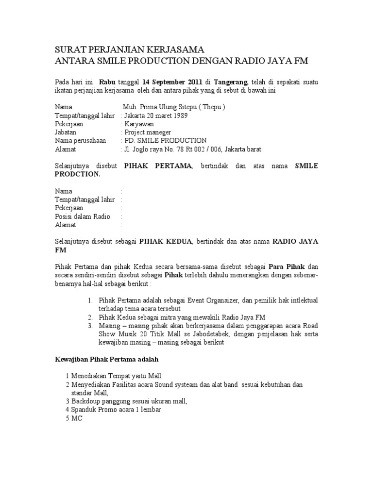 Contoh Perjanjian Investasi Bagi Hasil Kayamara Jaya Barokah from www.kayamara.com Dan didalamnya selalu memuat isi tentang pernyataan diri yang disaksikan oleh beberapa orang. Surat kontrak kerjasama event organizer. Melihat kembali pada pengertiannya, surat perjanjian kerjasama memiliki banyak macamnya. Dalam setiap contoh tersebut, surat sebagaimana surat resmi lain, surat kerjasama memang punya format penyusunan tersendiri. Biasanya, surat ini dapat digunakan dalam berbagai kebutuhan sebagai pengingat akan. Contohnya, surat pernyataan cerai atau surat untuk menyampaikan kesalahan. Dengan ini menyatakan bersedia untuk bekerjasama d engan pelak sana kegiatan. Berikut ini contoh surat pernyataan kerja yang dibuat oleh calon pegawi pada saat akan masuk menjadi pegawai perusahaan.